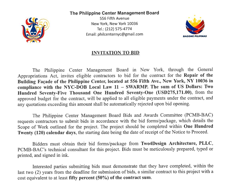 Holiday Notice Loading… History Offices Artists Consulate Bulletin Board “Eight Decades Of Harmony”: Philippine Consulate General, New York City Opera, and Manhattan School of Music Celebrate 80 Years of PH-US Relations in Landmark ConcertNotice of Resident Election Registration Board (RERB) Meeting, 20 April 2026Philippine Consulate General in New York Honors Filipino Bravery and WWII Heroes at 84th Day of Valor CommemorationPhilippine Consul General and New York Consular Corps Strengthen Cooperation with NYPDNew York PCG and Philippine Airlines Strengthens Partnership to Boost Philippine Tourism News & Events Read More Read More Read More